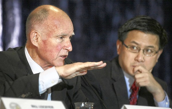 Gov.-elect Jerry Brown, left, shown with state Controller John Chiang, will enter office with California facing a $28-billion budget shortfall. His plan is expected to rankle both sides of the aisle. (Brian van der Brug / Los Angeles Times / December 14, 2010)