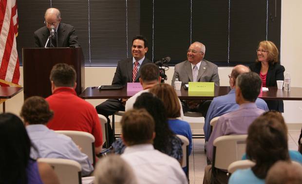 Gary Miller steps off the stage after speaking during a ribbon cutting ceremony for the Colton Crossing on Wednesday, August 28, 2013. (Stan Lim/Staff Photographer)