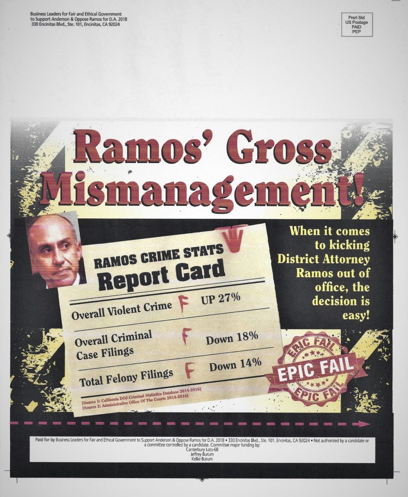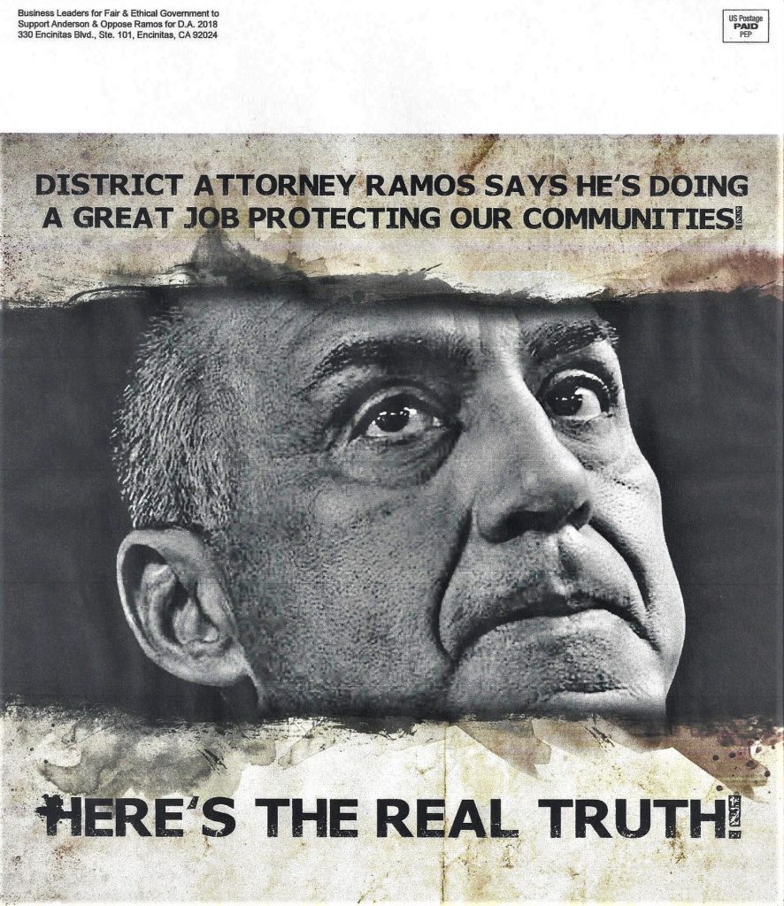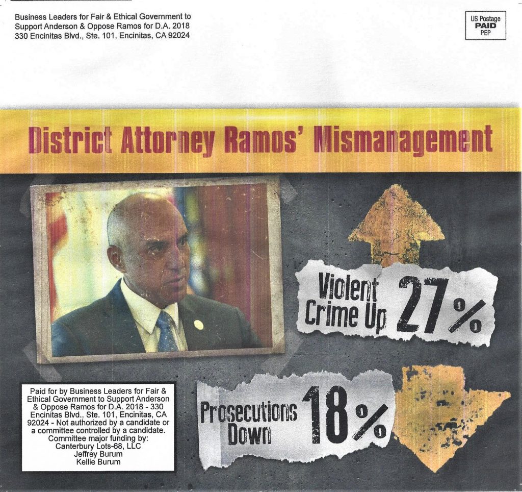 HIGHLAND — A political action committee set on throwing San Bernardino County District Attorney Mike Ramos out of elected office has launched its first political mailer in the contest.